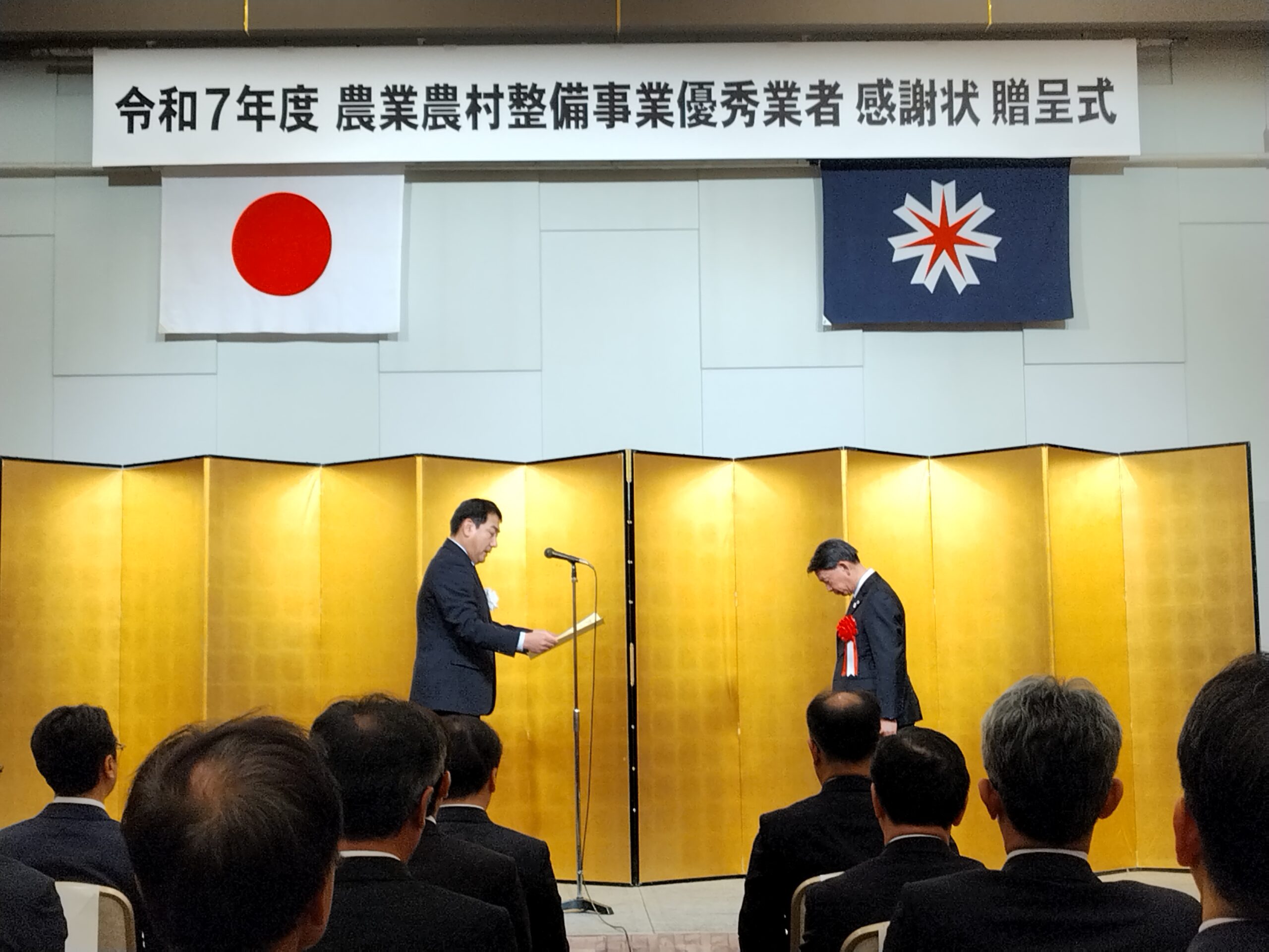 この感謝状は、令和6年度に農業農村整備事業で施工された農業土木工事の施工成績等が特に優秀な請負業者に授与されるもので、当社を含めて26社に授与されました。