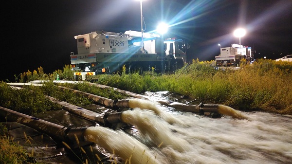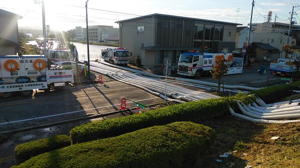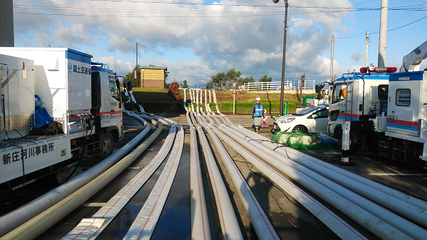 両名は10月13日(日)に小樽から新潟行のフェリーで本州に向けて出発し、14日に現地に入り、現在、浜尾遊水地で排水ポンプ車による排水作業に従事し、復旧に尽力しました。