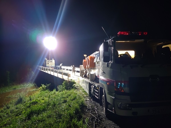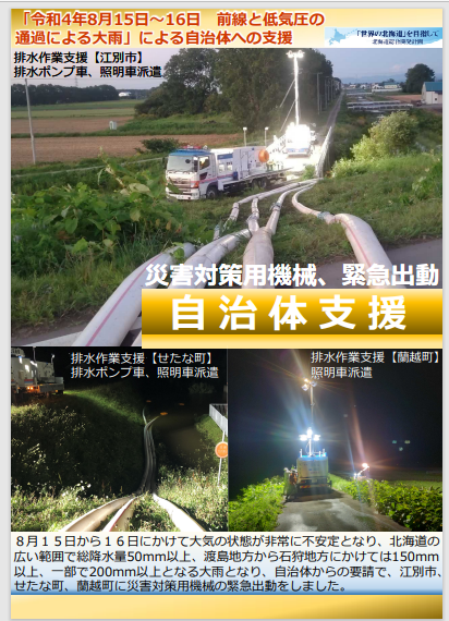 令和4年8月15日~16日の前線と低気圧の通過による大雨による自治体への排水作業支援として、江別市に排水ポンプ車、照明車と職員3名を15日~17日の3日間、蘭越町に職員2名を15日~16日の2日間、緊急出動し、排水作業及び夜間の照明作業に従事しました。