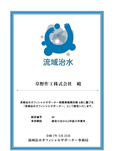 弊社は、令和6(2024)年6月、「災害時の避難場所の提供や非常用自家発電装置を活用したスマホの充電サービス、本社井戸から地下水の提供」を実施していることから、国土交通省からオフィシャルサポーターとして認定され、以来、北海道の流域治水の一端を担っています。(令和7年5月21日更新)