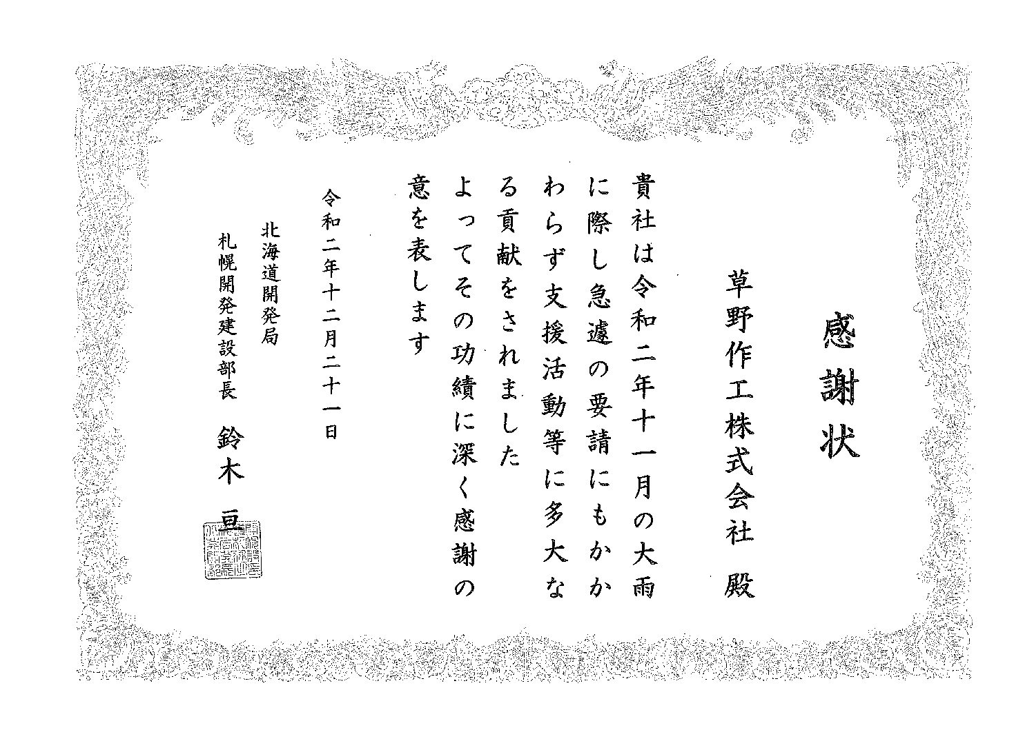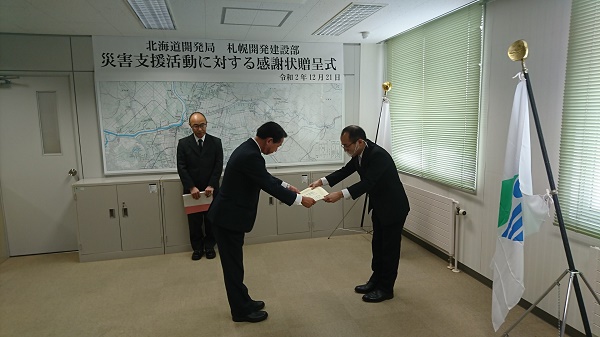 この際の急な出動要請に迅速に対応して災害支援活動に当たったことに対して、令和2年12月21日に札幌開発建設部から当社に感謝状が授与されました。