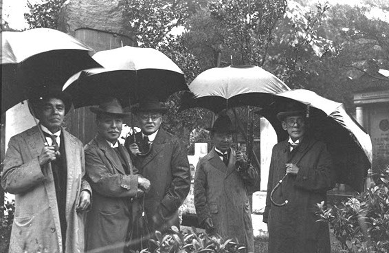 1927(昭和2)年、札幌農学校時代に宣教師M.C.ハリスから洗礼を受けた第1期生・2期生によるハリスの墓参りの様子。左から2人目が廣井勇、右端が伊藤一隆 (北海道大学附属図書館 所蔵)