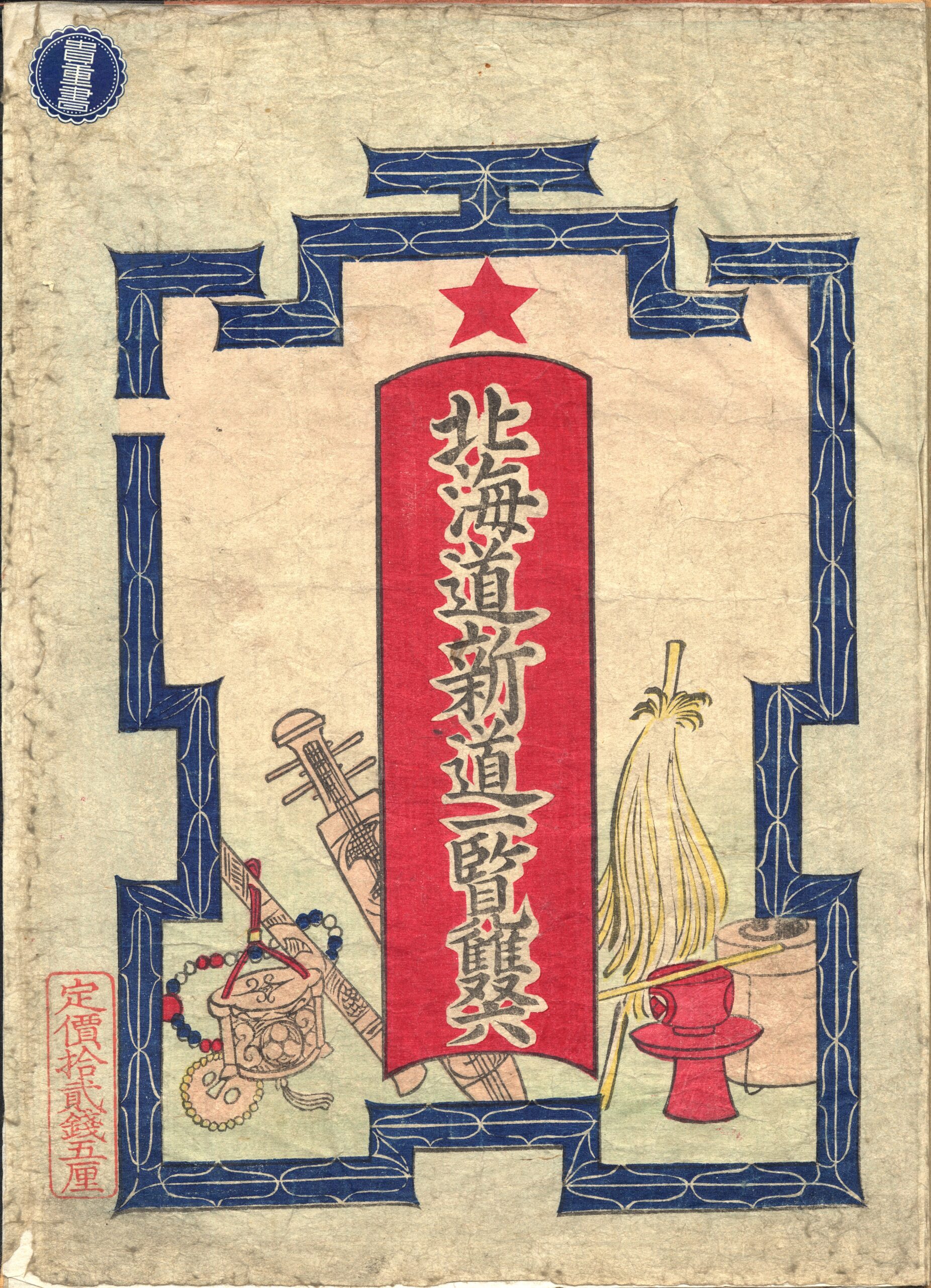 弥十郎が編さんした「北海道新道一覧双六」。表紙にはアイヌのモチーフが美しくデザインされている (函館市中央図書館 所蔵)