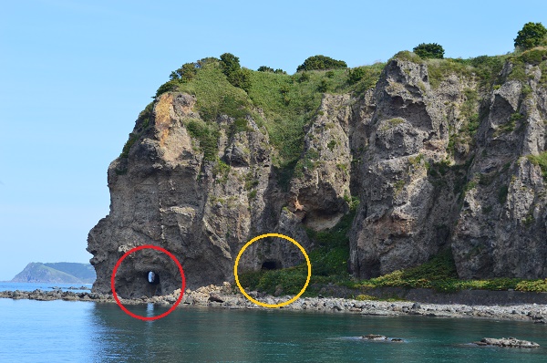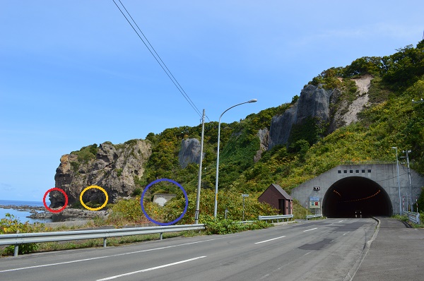 下の写真は、神威岬と島武威海岸のほぼ中間地点に位置する武威岬ですが、一番右側のトンネルは2001(平成13)年に完成した現在の武威トンネル(長さ700m)で、その左側に3本のトンネルが並行して掘られています。半分隠れていて見にくいのですが、青〇が1965(昭和40)年完成の旧トンネル、そして岬の突端に2つの手掘りのトンネルがあり、黄〇が1922(大正11)年完成の長さ約70mのトンネル、赤〇が1889(明治22)年完成の長さ12mのトンネルです。