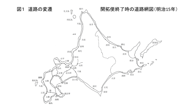 本州の道路は、江戸時代までに5街道をはじめ町と町を結ぶ主要街道などの諸街道が1万キロメートル以上整備されていたのに対し、北海道の江戸時代までの道路は、アイヌがコタン間を往来するための道や、沿岸防備の目的から松前藩が依頼して場所請負人の出資などで整備した山道などがあるのみでした。