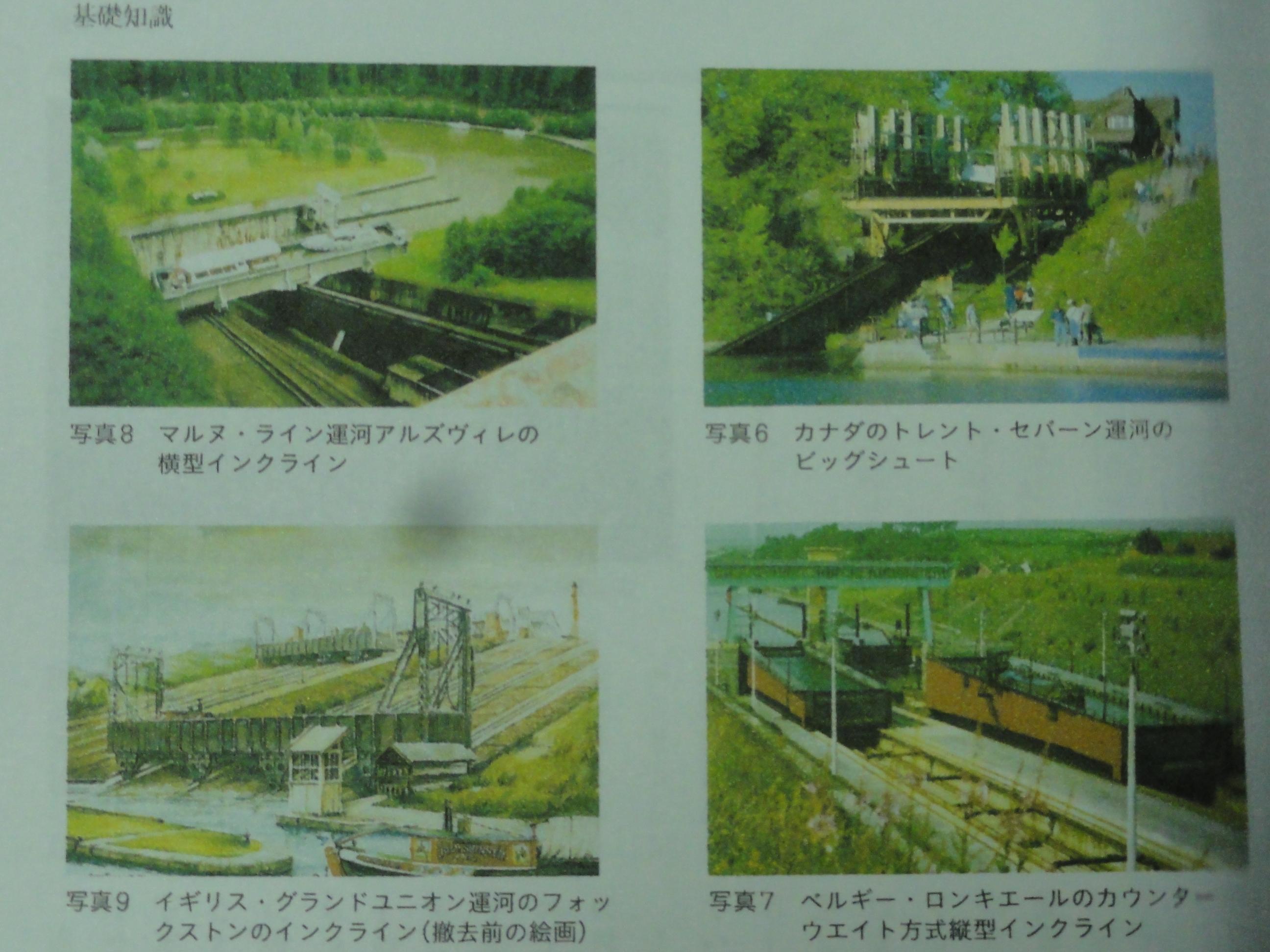 この本では階段式運河以外に、欧州ではリフト(エレベーター)、インクライン、ビッグシュート(ケーブルカー式インクライン)、カウンターウエート式インクライン、大型船舶用横型インクライン、回転リフト式インクラインの例が紹介されている。インクラインは京都琵琶湖疏水の蹴上インクラインと異なり、欧米では産業革命進展下で大量錬鉄使用が可能となって各国の産業革命の発展を反映して、鉄骨製の大型構造物が多い特徴がある。この技術例として、水平運河ではフランス・リール運河、ドイツ・ルール運河、階段式ではイギリス・ヨーク運河、イギリス・リ―ズ・リバプール運河、リフトではカナダ・トレンチ・マージー運河、インクラインではビッグシュートの例としてカナダ・トレント・セバーン運河、カウンター・ウエート式ではベルギー・ロンギエール運河、横型インクラインの例ではドイツ・マルヌ・ライン運河、その巨大横型ではイギリス・グランドユニオン運河、最新の回転式インクラインでは、落差10mをかつて11段階段式で昇降に2時間を要したものが15分で通過するリフト技術に改良をそれぞれ紹介している。