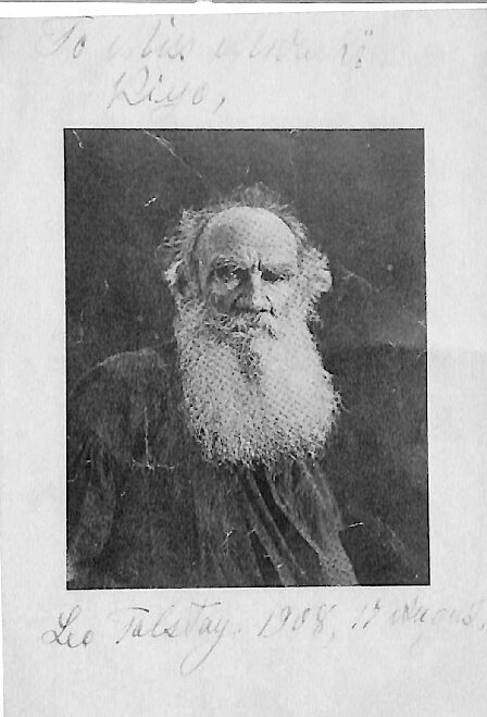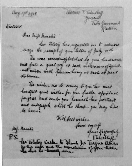 拝啓 レオ・トルストイは7月12日付の貴信を確かに受け取った旨、あなたにお知らせするよう、私に依頼がありました。彼は、あなたの親切な お言葉に大変感激し、このような遠い国に住む人と精神的に結びつけたことを喜んでいる次第です。