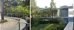 例えば、初期段階の計画手法の違いとして、立地環境設計やコンセプトでは、「立地する土地の地域性や環境の特徴を伝える」ことや、「最小限の地形改変」、「地形を積極的に取り込んだ設計」など、その土地の生かし方の工夫などが確認できました(写真-3,4)。このことは、国内の「道の駅」の整備において、一度用地を平らに整地して、樹木類もすべて伐木後に、新たに植栽している事例が多いことと比較して大きな違いです。