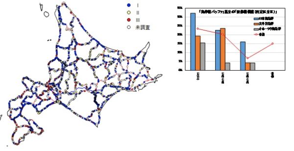 GIS(地理空間情報システム)を使って、海岸(日本海・太平洋・オホーツク海)からの距離と要修繕橋梁の関係を分析すると、海岸線からの距離が近くなると要修繕橋梁の比率が高くなり、特に日本海側が顕著であることがわかります(図-5)。