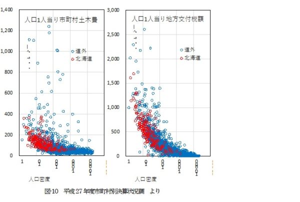 人口規模が小さな町村・人口密度の低い地域では人口一人当たりの総歳出額が高く、土木費支出額も大都市に比べて多い現状にあります。