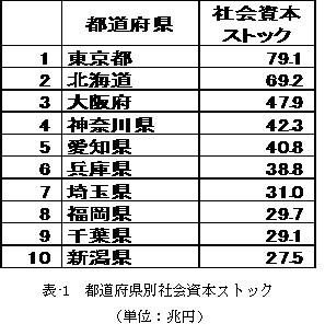 内閣府の経済財政モデル1)によると、我が国の社会資本ストックは927.7兆円、北海道では69.2兆と推計されています。北海道は、東京都に次いで都道府県別で第2位(表-1)。人口一人当たりで見ると、全国平均で約7.3百万円(北海道は12.8百万円)の社会資本ストックが地域の生活・経済活動を支えています。