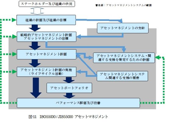 ISOは、資産(アセット)のマネジメント・システムとして2014年にISO55000シリーズを発行しました。ISO55000「概要、原則及及び用語」、ISO55001「要求事項」、ISO55002「適用指針」で構成されており、我が国においては2017年にJIS制定となっています。組織で有するアセットを、「コスト」と「リスク」と「パフォーマンス」のバランスを図りながら、ライフサイクル期間で最大の資産価値を生み出すことを目的としたマネジメント・システムです。既に下水道事業等での適用事例があり、今後、このようなマネジメント・システムの導入により戦略的な維持管理・更新に向けた取り組みが期待されます。