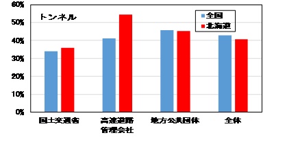 道路トンネルでも、橋梁と同じように判定区分Ⅲ以上の要修繕トンネルの比率が全国に比べて高くなっています(図-6)。また、舗装の分野では、冬期の路面凍結問題や凍上、融雪期の泥濘化やポットホール発生など、積雪寒冷地域特有の過酷な環境下にあって、維持管理・補修が課題となっています。