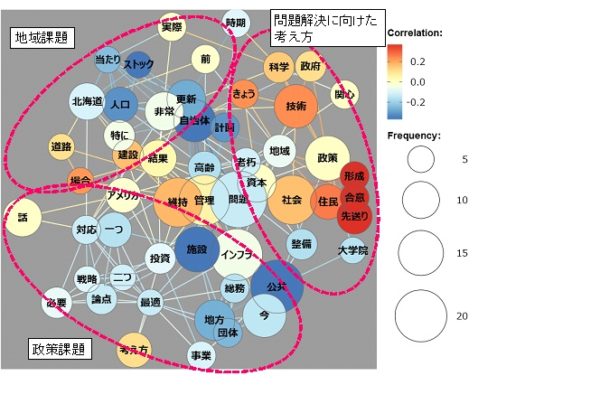 北海道大学では、SIP技術の社会実装に向けて、社会科学的アプローチによる地域実装のための政策課題検討等に取り組みました。パネルディスカッション等における議論結果をテキストデータに反訳、テキストデータ計量分析(テキスト・マイニング)を行い、政策課題として検討すべき社会的背景として「地域経済の動向」「人口動態(人口減少・少子高齢化)」「地方財政の動向」について論点整理を行ないました。