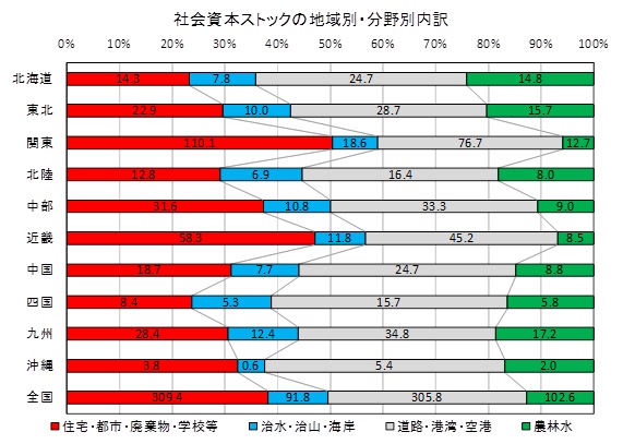 社会資本ストックを都市系(住宅・上下水道・都市公園・廃棄物・教育等)、国土保全系(治水・治山・海岸)、交通系(道路・港湾・空港)、農林水産系の4分野に大別して図-1にまとめました。北海道は、都市系社会資本ストックの構成比が小さく、農林水産系や交通系の社会資本ストックの構成比が高いことが特徴です。
