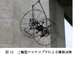 室蘭工業大学では、平成29年8月に国道37号室蘭市白鳥南高架橋P3橋脚で、SIP維持管理技術のデモンストレーションとして「二輪型マルチコプタによる橋梁点検」を実演しました。この技術は富士通株式会社が中心となり名古屋大学、東京大学、北海道大学、ドーコンによる共同研究体制による技術開発が進められてきたもので、人による点検が困難な箇所(高さの高い橋脚等)の画像を近接撮影するマルチコプタと点検データを様々な用途に活用可能な点検データ管理システムの開発を目標としたものです。