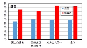 北海道と全国の橋梁年齢分布を比較すると、北海道の橋梁は全国に比べると約10年くらい若い(図-2)のですが、点検結果を比較すると判定区分Ⅲ以上の要修繕対応比率は全国よりも北海道の方が高くなっています(図-3)。