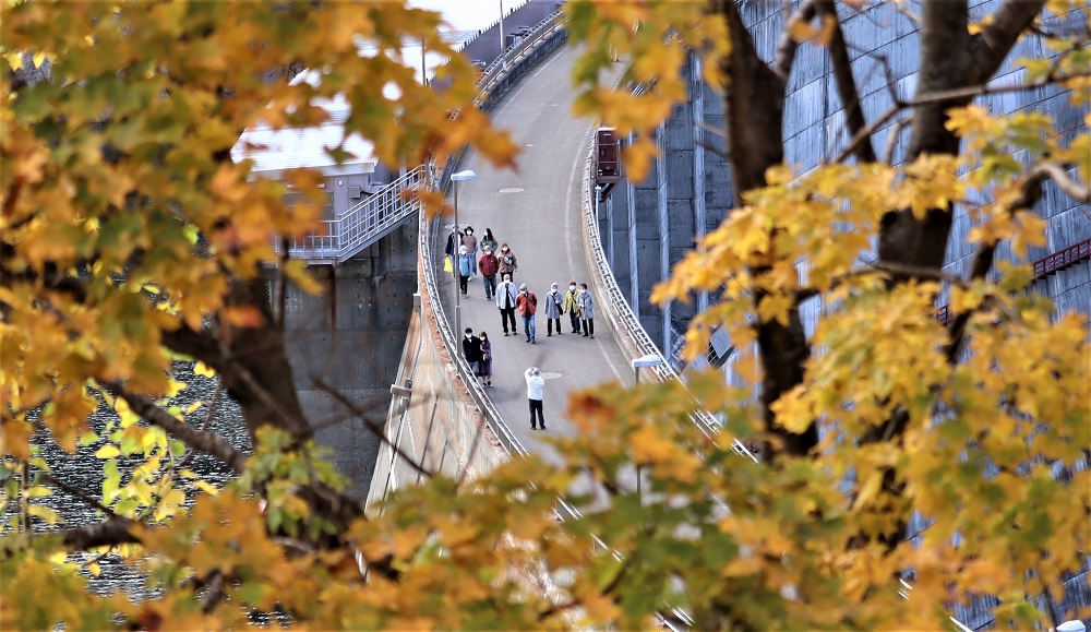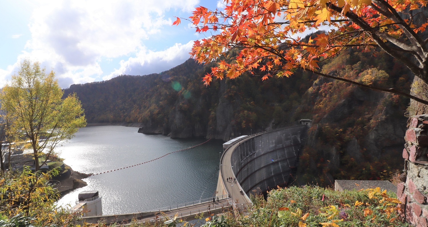 緩やかな弧を描くアーチ式の豊平峡ダムを、渓谷の冷気が包んでいた。堤頂に立って見渡せば、そそり立つ岩肌で紅葉や黄葉が輝き、その一葉一葉が風に踊っている。自然が創り出した雄大な峡谷と、技術の造形である巨大なダムがコントラストを織りなす錦秋の風景は劇的でさえある。