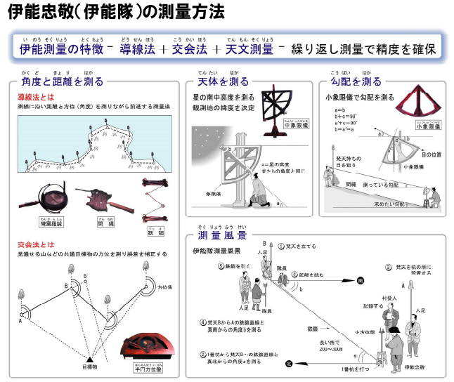 大友亀太郎の大友堀開削は、当時としては一大事業でしたが、その成功の一因として、建設に着手する前のしっかりとした基本測量が挙げられます。大友亀太郎は、伊能忠敬から測量技術を受け継いだ二宮尊徳の弟子だったので、大友堀の建設にも伊能忠敬の用いた測量方法と測量器具が活用されました。