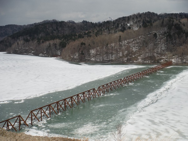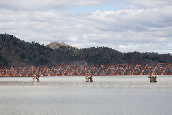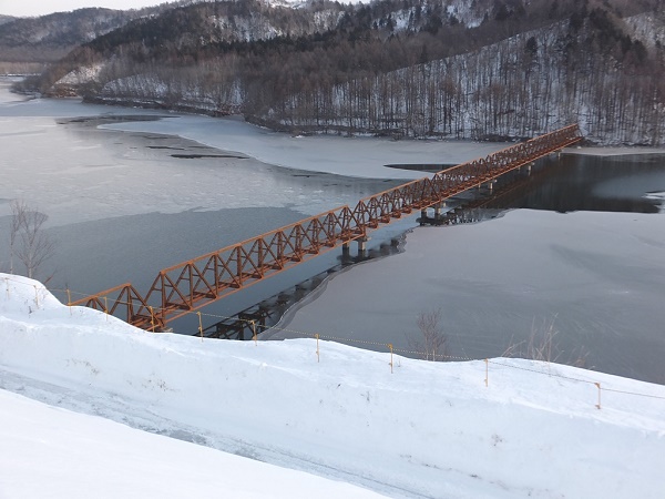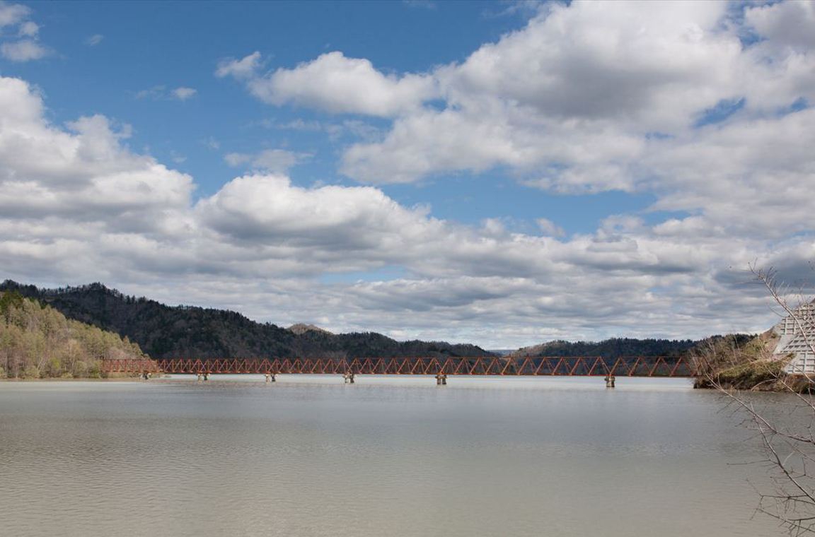 三弦橋という名称は、三弦トラス構造に由来します。上弦材が1本、下弦材が2本の断面が三角形で、四角錐を連ねた特異な形状のこの構造は、鉄道橋としては世界的にも珍しく、建設費用を低減し、夕張岳を背景とした自然景観との調和にも配慮して採用されたと言われています。美しいスタイルのトラス橋は、この地区にあった郵便局の消印にも使われ、シューパロ湖のシンボルとして親しまれてきました。