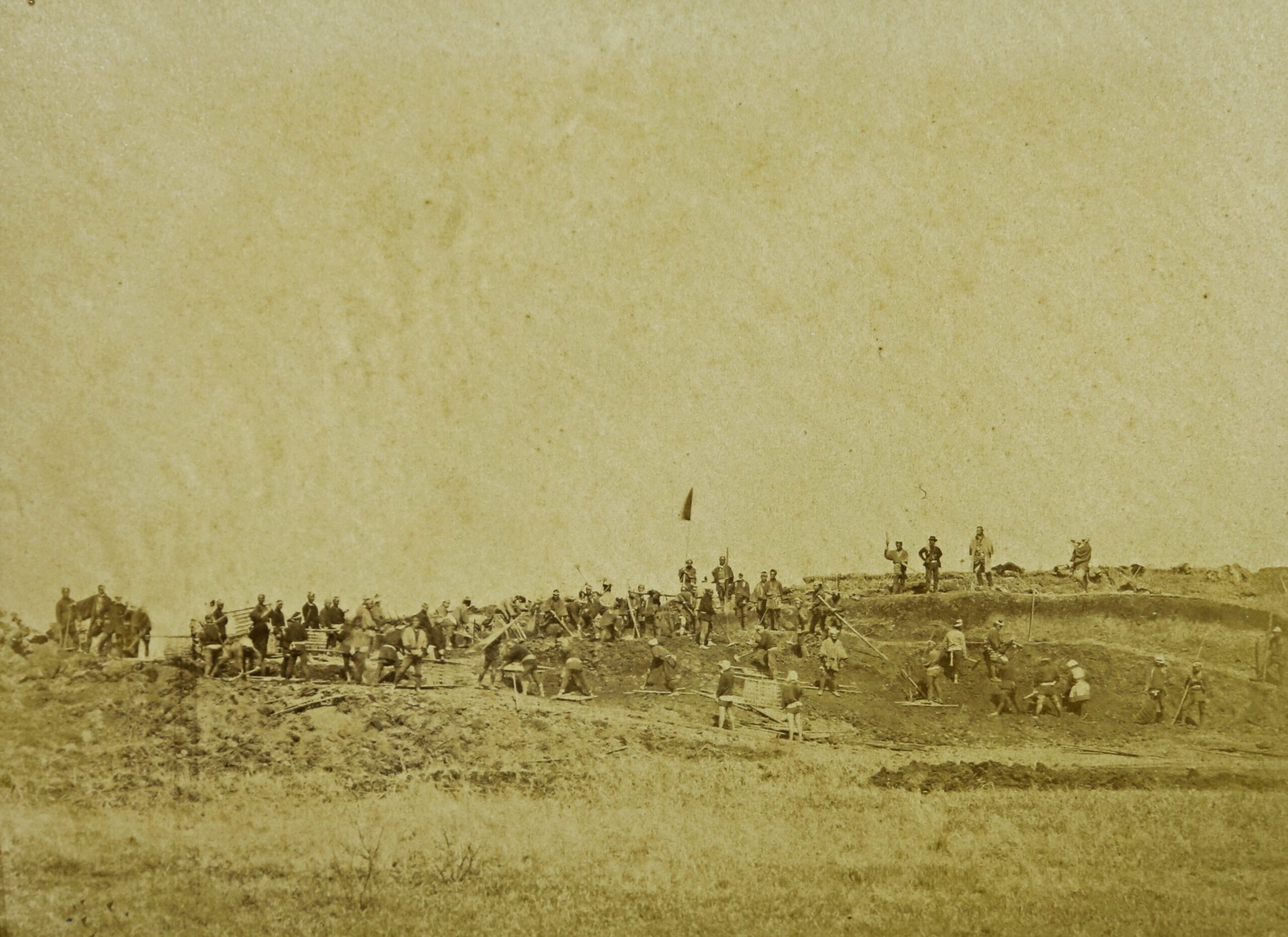 作業員は請負人を通して全国から集められ、技量試験を行い約5400人が採用された。これは亀田・桔梗野での谷地の埋め立ての様子 (北海道大学附属図書館 所蔵)