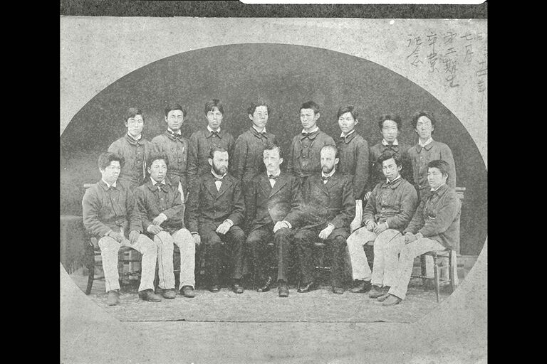 卒業間近の1881(明治14)年7月、廣井勇(後列右から2番目)、内村鑑三、宮部金吾、新渡戸稲造など12名の札幌農学校第2期生と教授たち(北海道大学文書館 所蔵)