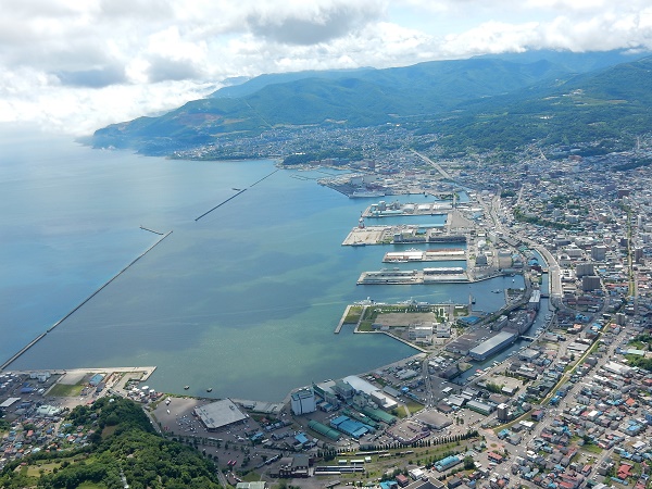 現在の小樽港北側から見た防波堤。手前が北防波堤(北海道開発局小樽開発建設部小樽港湾事務所)
