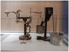 ミハエリス二重てこ式試験機。散弾(鉛玉)を落下させ、その重みでモルタルブリケット を切断した(北海道開発局小樽開発建設部小樽港湾事務所 所蔵)