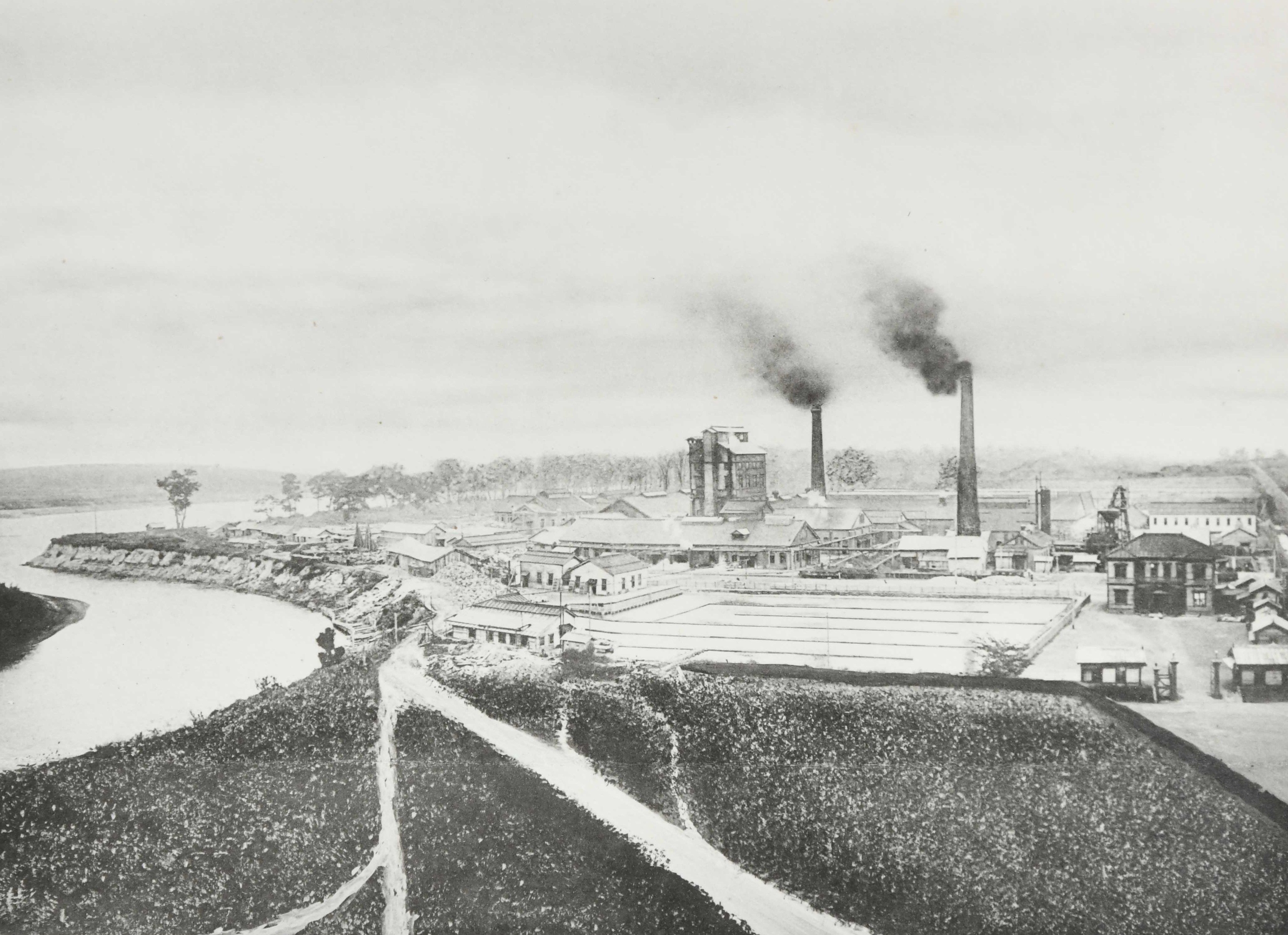 明治37年創業の富士製紙工場(現・王子製紙江別工場)。工事の際には、この煙突が「人馬や機械の進撃の目標となった」と保原は回想している(北海道大学付属図書館 所蔵)