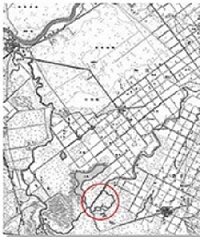明治42年頃の、木詰の流路を真っ直ぐに切り替えた後(赤い丸の部分)の夕張川(出典 北海道開発局札幌開発建設部HP)